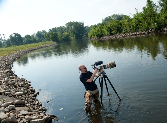 Matthew Clysdale sets up his camera in the Kalamazoo River. Although the river is known to have long been polluted with PCBs the birds have been feeding from it.