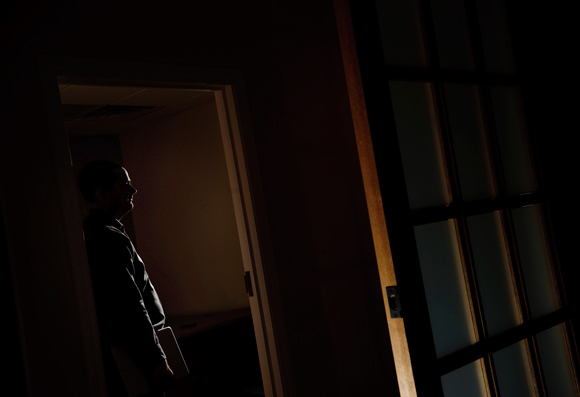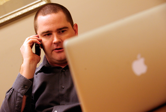 Daniel Jefferies, President of Newmind Group Inc., talks with a client on the phone at their offices in Kalamazoo, Mich.