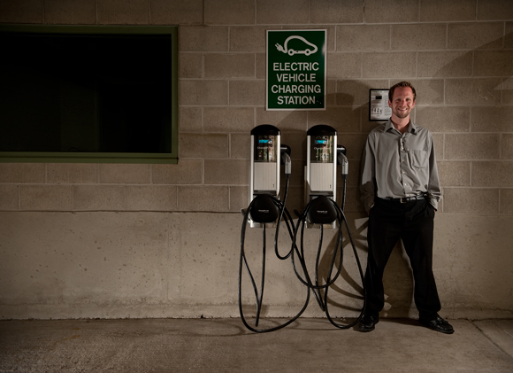 Daniel R. Doehrman at the Rave parking ramp on Portage Road with a charging station for a plug-in electric vehicle.