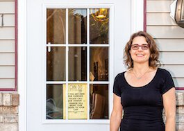 In front of the Can Do Kalamazoo Building is Executive Director Lucy Dilley.