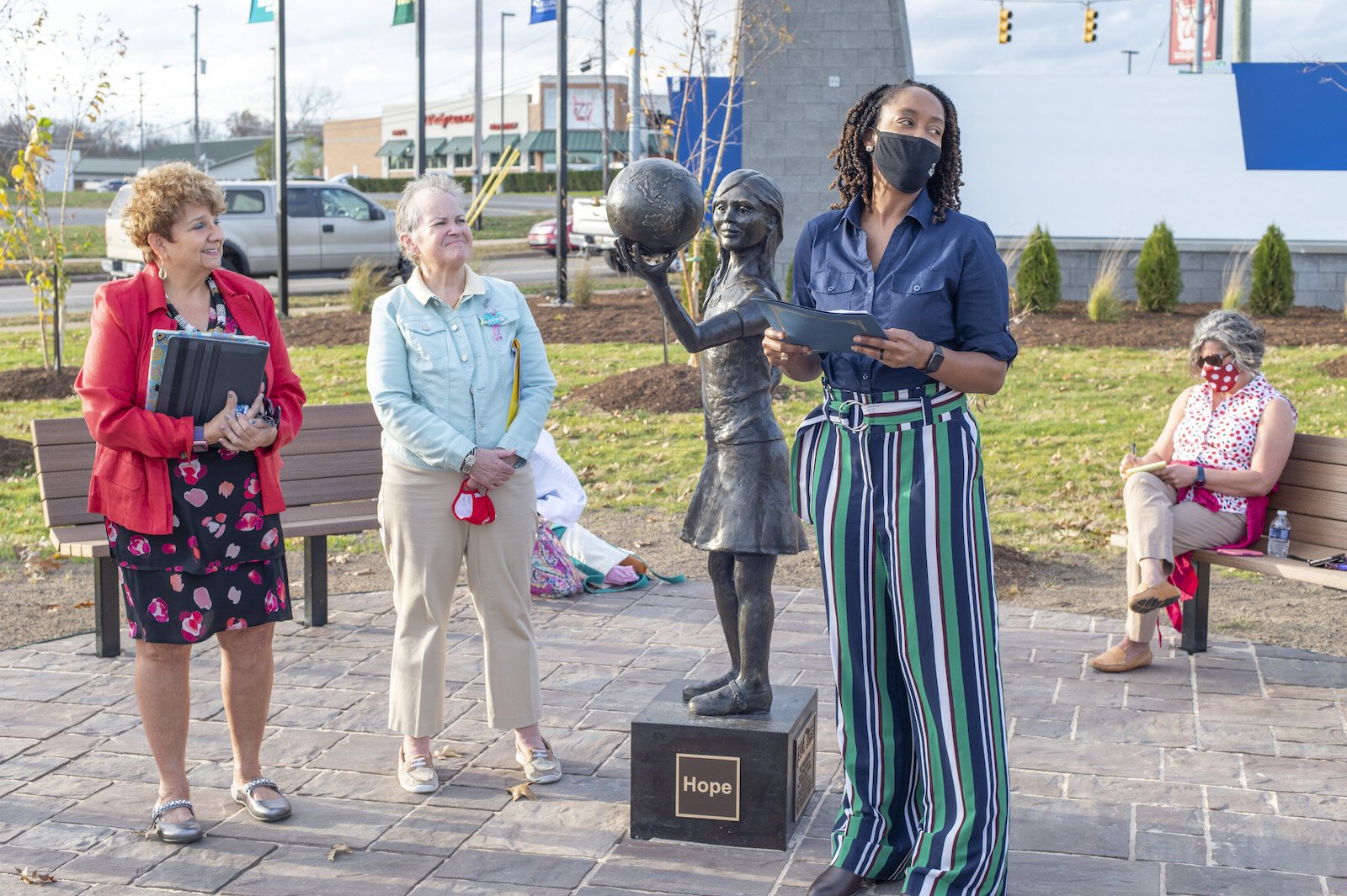The name of the overall project to commission and install the statue was titled “What’s Next World?” says Kathy Shaw, co-chair with Calley-Martin.