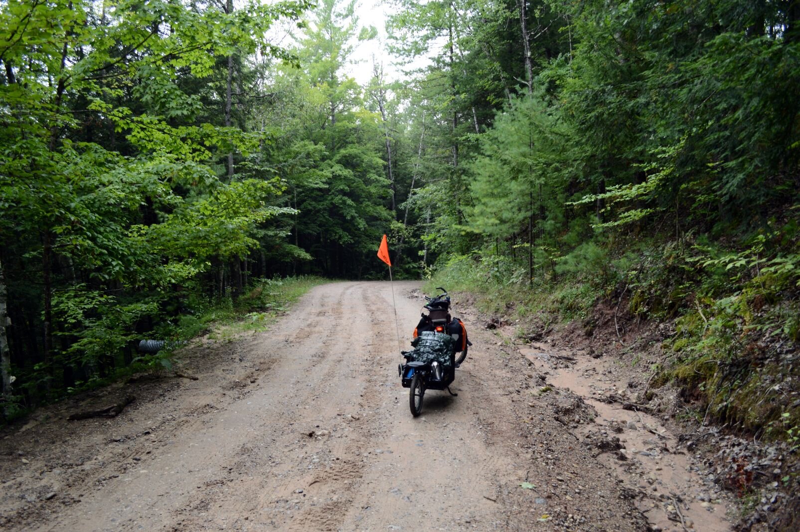 I started to lose track of time and place on day three while trying to sleep at a national campground at Nichols Lake. Heard the sound of loons. Then the very loud sporadic whoo of an owl. Then the sound of thunder that grew into a storm. I run out of my tent in my underwear at 4 a.m., to make sure all my stuff is sealed up in my drybags and Ortlieb panniers. Get back in the tent just in time to lie awake to the downpour and wild lightning.