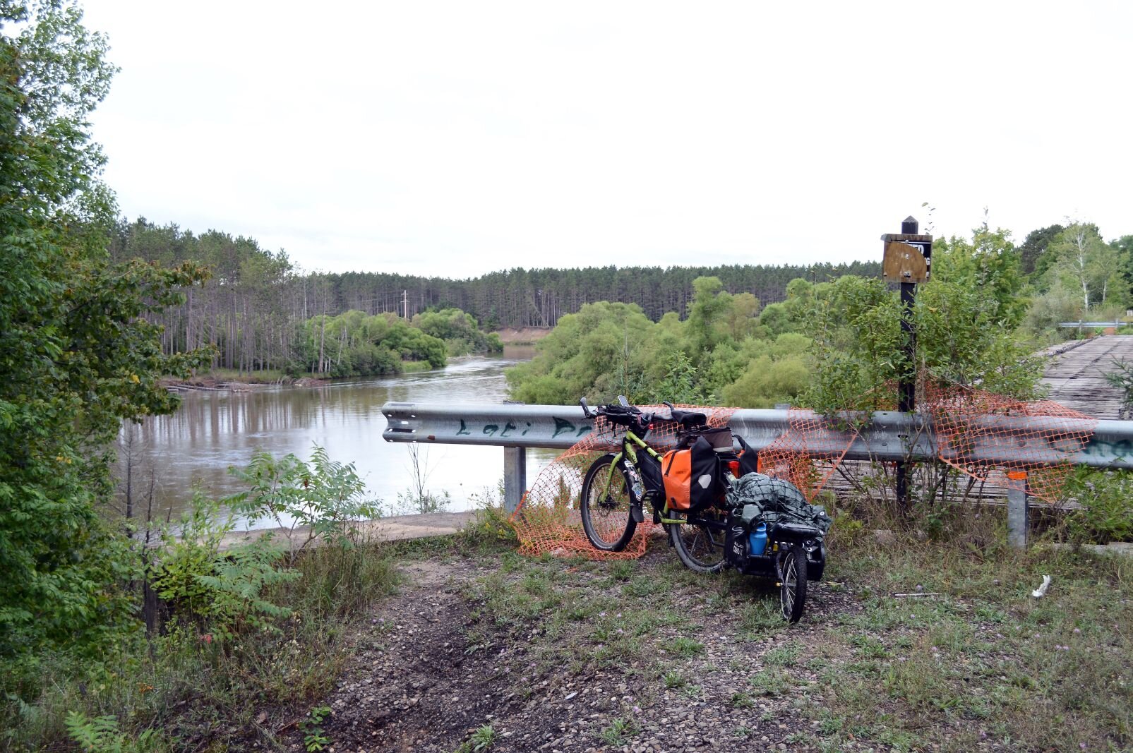 On day six, the first time going to the Mesick area, I only had 30 miles to go. No rush, as I bumped and slid and churned my wheels along Upper River Road, which looks to be a service road along a stretch of power lines. On my left, towering wooded ridge, over to my right through the trees, the Manistee River.