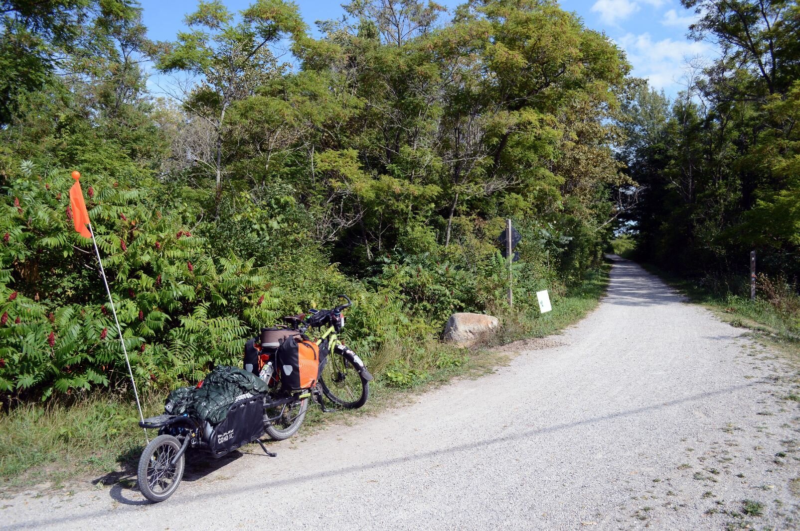 Here I am, with the bicycle equivalent of a loaded semi. Surprise! Weight is an issue here in the hilliest part of the Lower Peninsula. It’s bad enough on pavement, but on the many varieties of dirt roads, with surfaces that suddenly change in quality, the whole mess can help one develop new relations with physics.