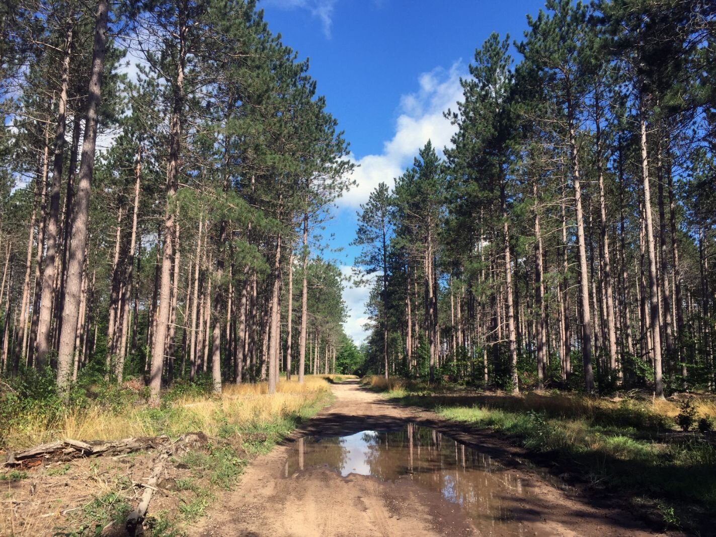 Google Maps shows me a convenient route* to get to Thompsonville, where the trail that leads to Frankfort has been improved for bikes. The road is dirt, but solid enough, and heads into tall pines. Since the trees are all in rows, it’s likely this is a plantation of FDR’s Civilian Conservation Corps, which reforested much of northern Michigan’s over-logged landscape during the Great Depression.