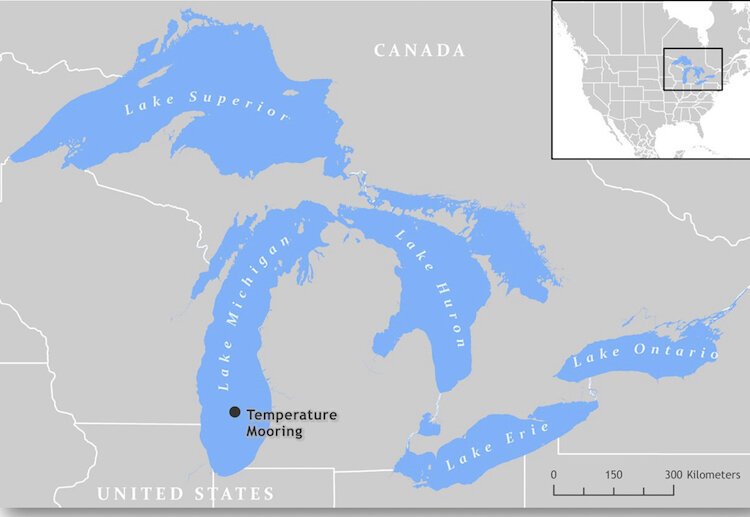 The data shows temperatures inching upward over that time, and also provides precise measurements of the timing of annual “fall overturn,” the point of minimum temperature, and the duration of the winter cooling period in Lake Michigan — all of which give a clearer understanding of the lake’s underwater “seasons.”
