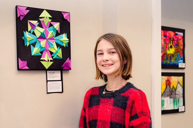 Lilyana, who is in 7th grade at Lakeview Middle School, describes the piece of art she created as being similar to a radial paperfold. The colors she chose to use were based on the blues, greens and purples that went into a an embroidery floss friendship bracelet she made earlier.