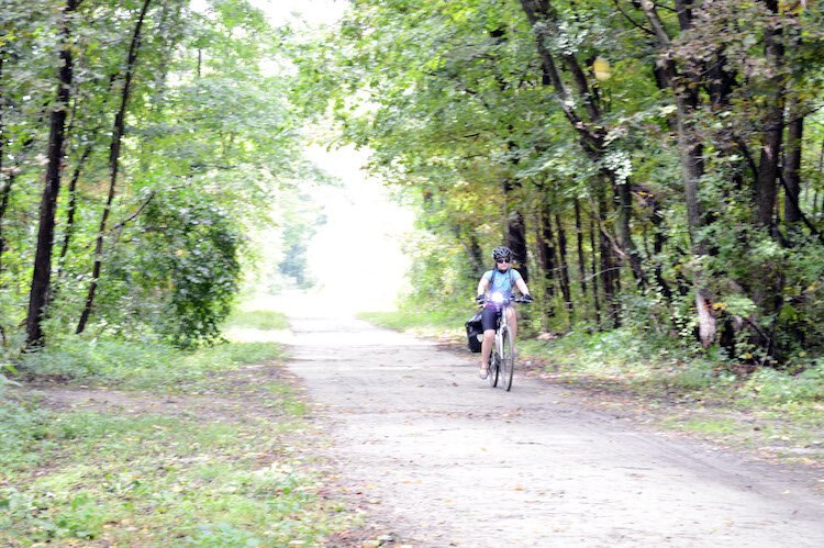 GLTL riders leave Mentha and push on, through the woods and up the forested slope to the Kal-Haven trailhead. A new trail heritage sign points out that the hill was formed by ice age glaciers, a fascinating fact that bikers can ponder as they mash pedals uphill.