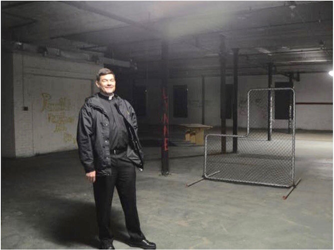Courtesy of St. Philip Church – Father John Fleckenstein on the steps at the Van Buren Street entrance to the Tiger Room. A million renovation of the building will convert it into an Accelerator for foodnd beverage product businesses.
