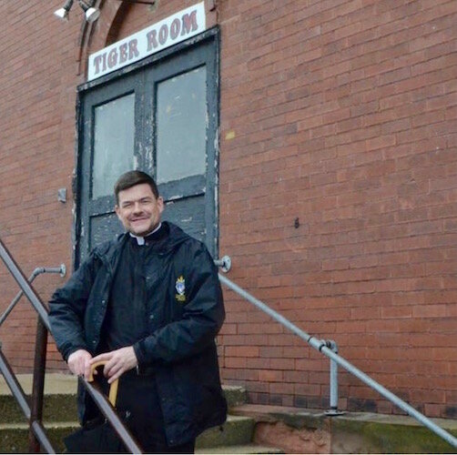 Father John Fleckenstein on the steps at the Van Buren Street entrance to the Tiger Room. A $4 million renovation of the building will convert it into an Accelerator for foodnd beverage product businesses.