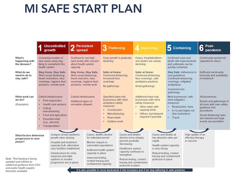 Members of that committee are gathering input to be used to determine guidelines for businesses in Michigan to re-open. On May 7, Gov. Gretchen Whitmer extended stay-at-home orders for many Michiganders but eased them for manufacturing. (See related story.)
