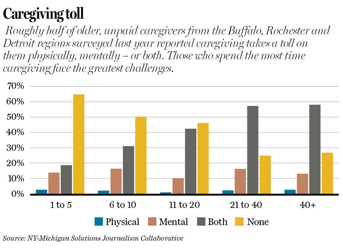 Roughly half of 1,000 unpaid caregivers surveyed last year in the Buffalo, Rochester, and Detroit regions said physical and mental health challenges came with their roles. The more hours spent caregiving, the greater those burdens. The same held true for the youngest, least educated, and lowest wage earners, according to the survey, commissioned by the New York-Michigan Solutions Journalism Collaborative.