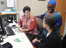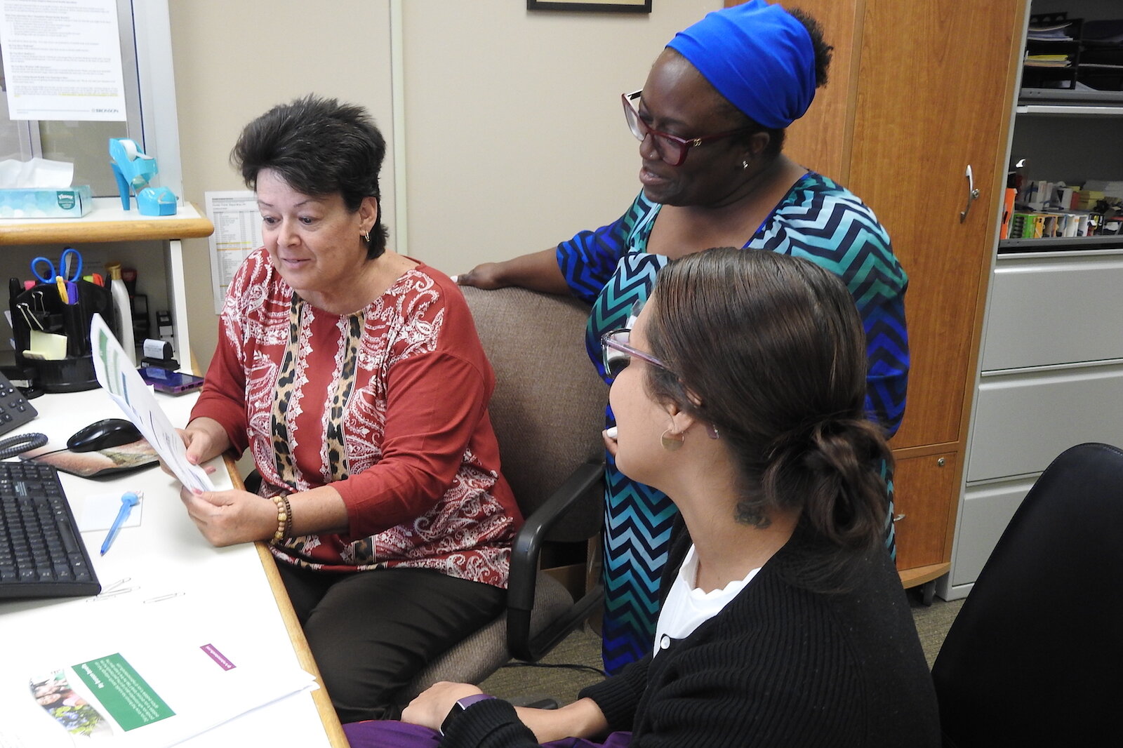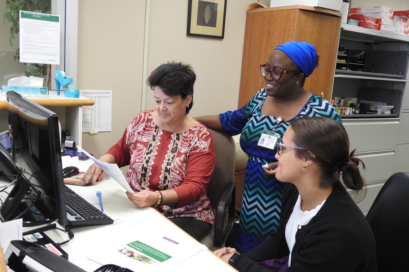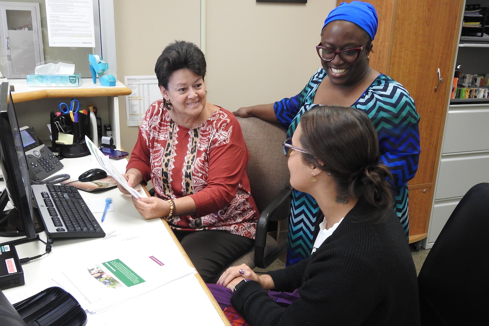 Julie Riddle – Elishae Johnson, directora de sistema de servicios de salud empresarial en Bronson Healthcare, consulta con la Especialista Administrativa Pam Milliron, a la izquierda, y la Especialista en Información Lexi King en Bronson Battle Creek Psiquiatría y