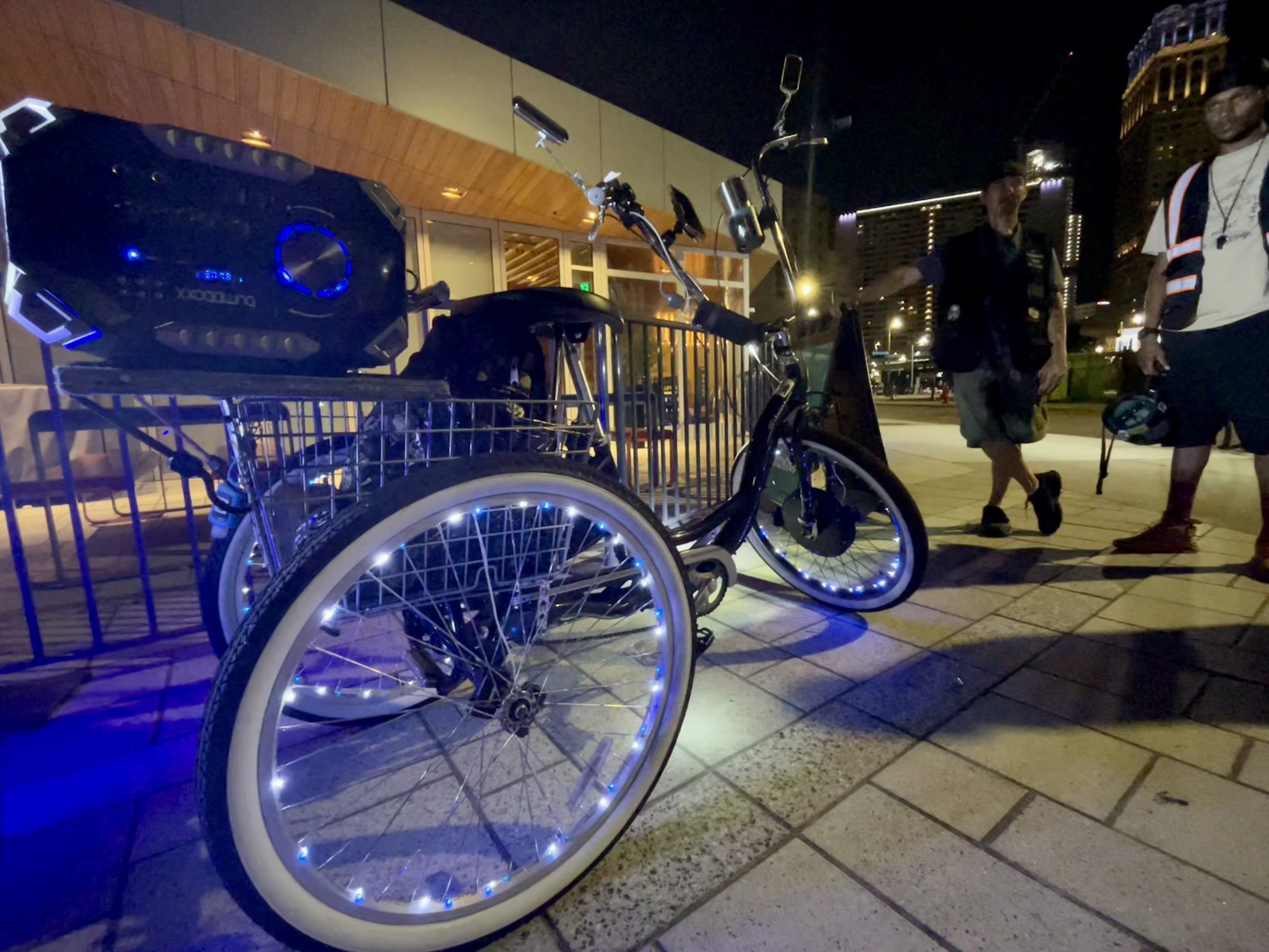 But traffic was mostly non-existent around midnight, except for downtown nightlife areas, where our bikes were inches from shiny sports cars and black-windowed SUVs, clubbers, and bar hoppers looking at our traveling display as if we’d landed from another planet.