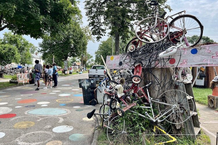 Guyton points to a tree stump that he’s hung with a massive amount of old bikes. “I love bikes… because bikes have a way of taking us where we need to go. I love riding them, I love the wind, and love riding my bike at night, and I love the stars up in the sky — and just the other day we had a full moon! I said, ‘Look at the full moon!’… It’s beautiful, beautiful, beautiful to be alive and to be able to ride my bike.”