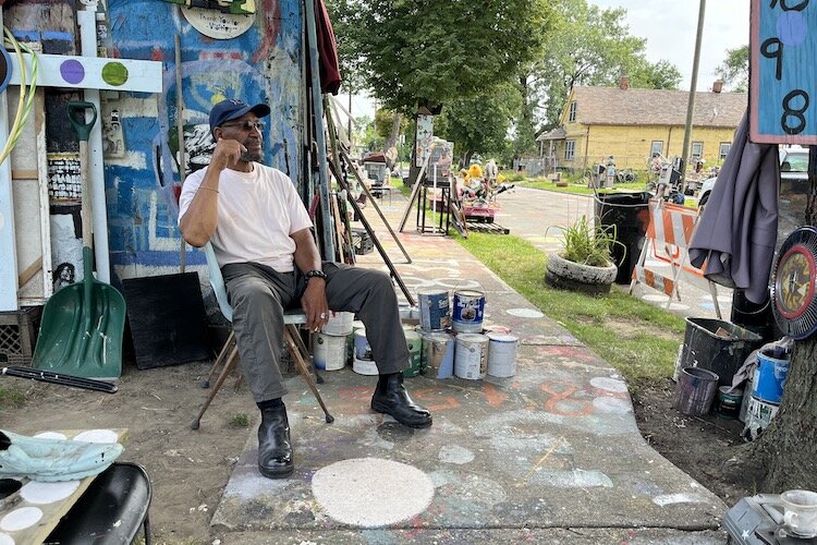 Some cars pass through, and people look at the art and wave to Guyton, but they don’t park to get out, to look at what he’s done.