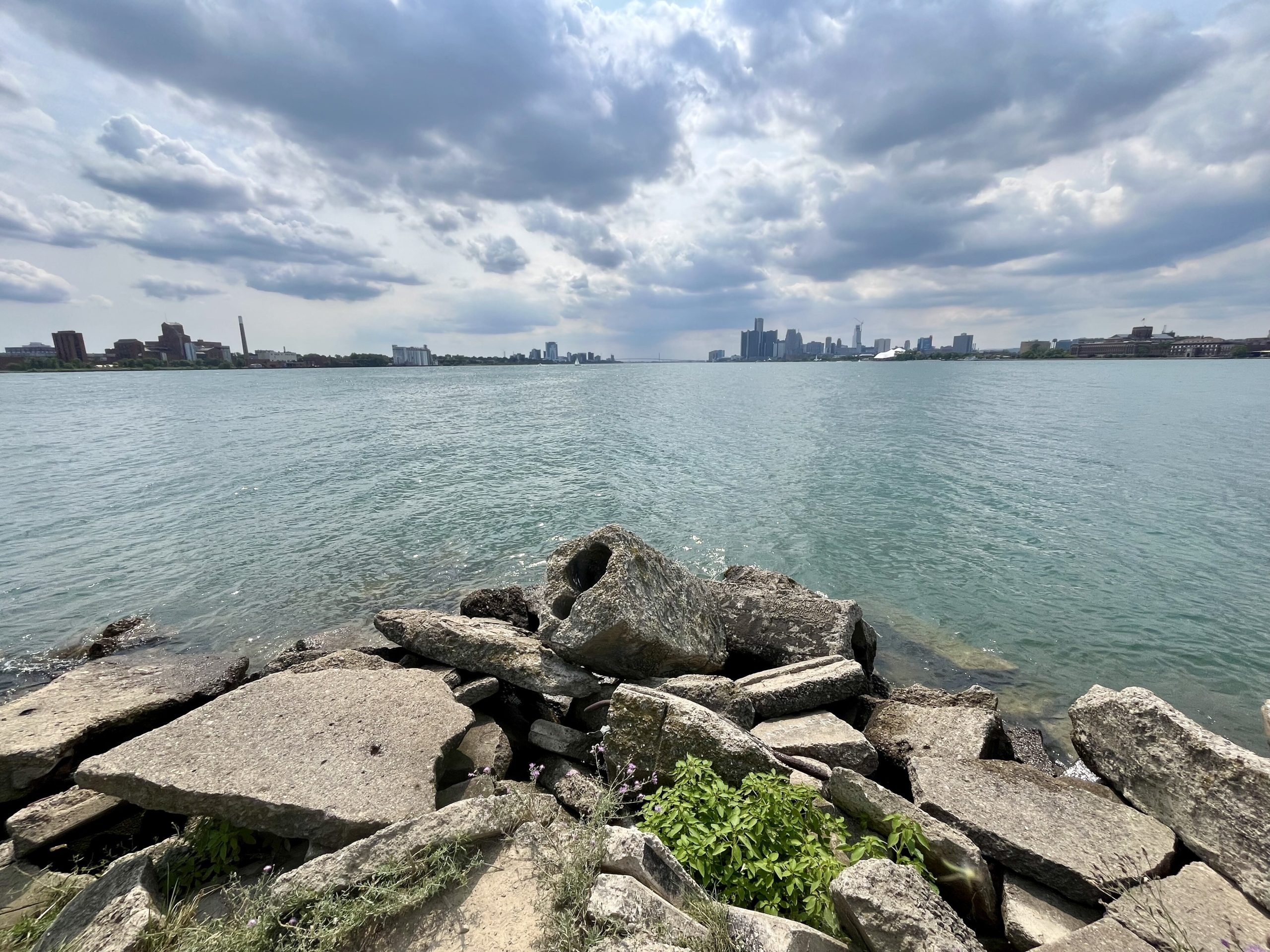 Down to the River, where we stop again to rest, stare over the water, and speculate on Marauder rides into Canada when the Gordie Howe Bridge opens next year.