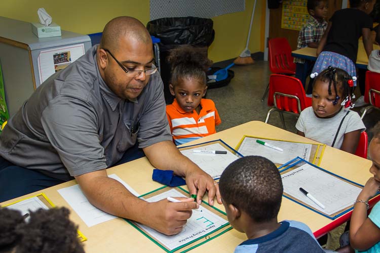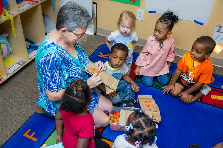 Susan Andress – Aerin Caldwell, Assistant Teacher, works with preschoolers to get them ready for kindergarten.