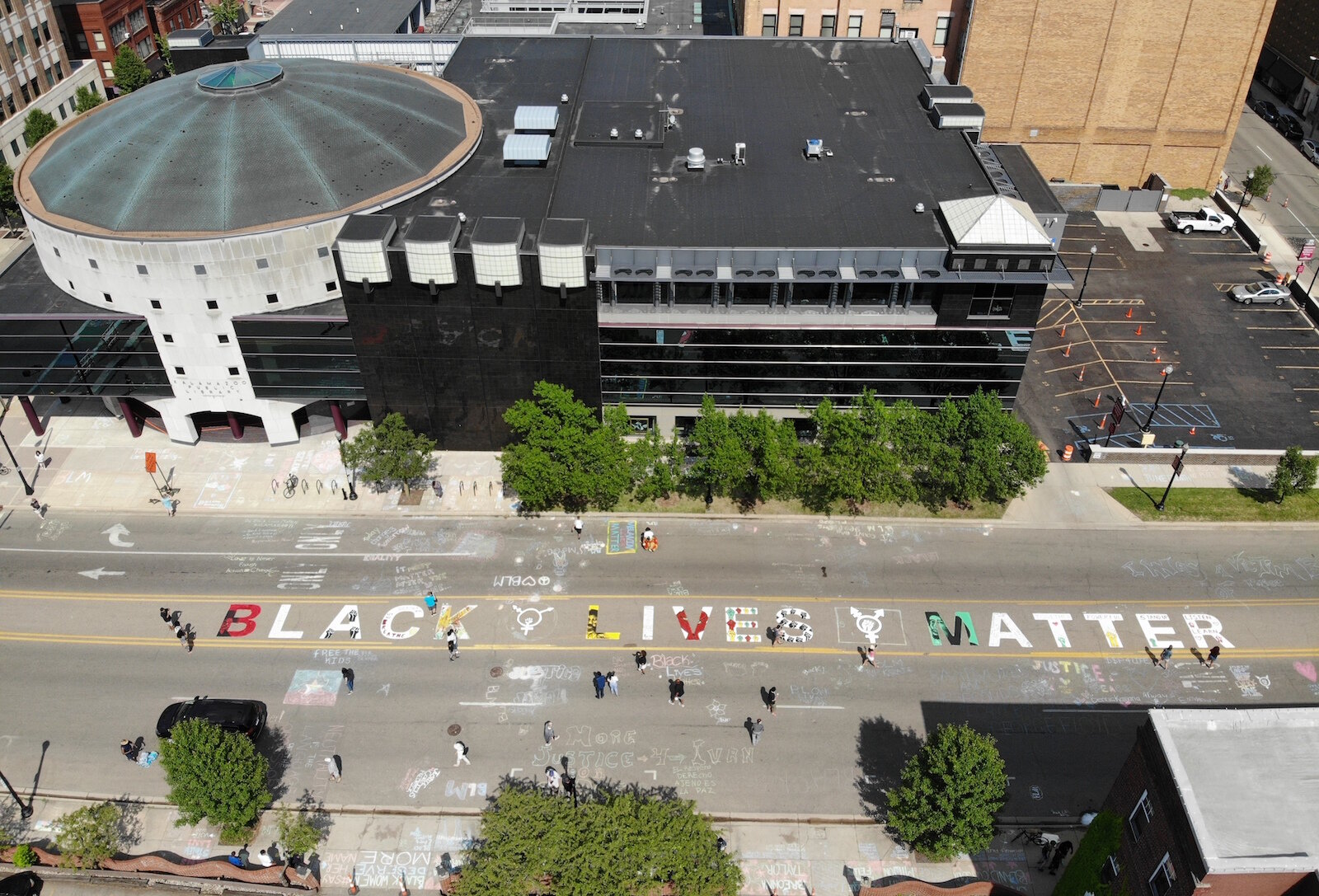 A drone’s eye view of artists downtown creating Kalamazoo Black Lives Matter street art, June 19 by Nate Hartmann.