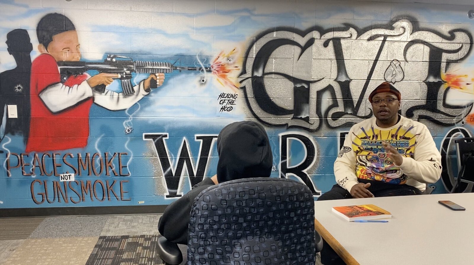 On a day in late March that still felt like winter, an 11-year-old boy was sitting at the head of a conference table, staring at a wall of graffiti depicting a kid firing a gun. The boy had run into some trouble. He wore a hoodie and a face mask, leaving only his eyes exposed as Yafinceio “Big B” Harris spoke to him.