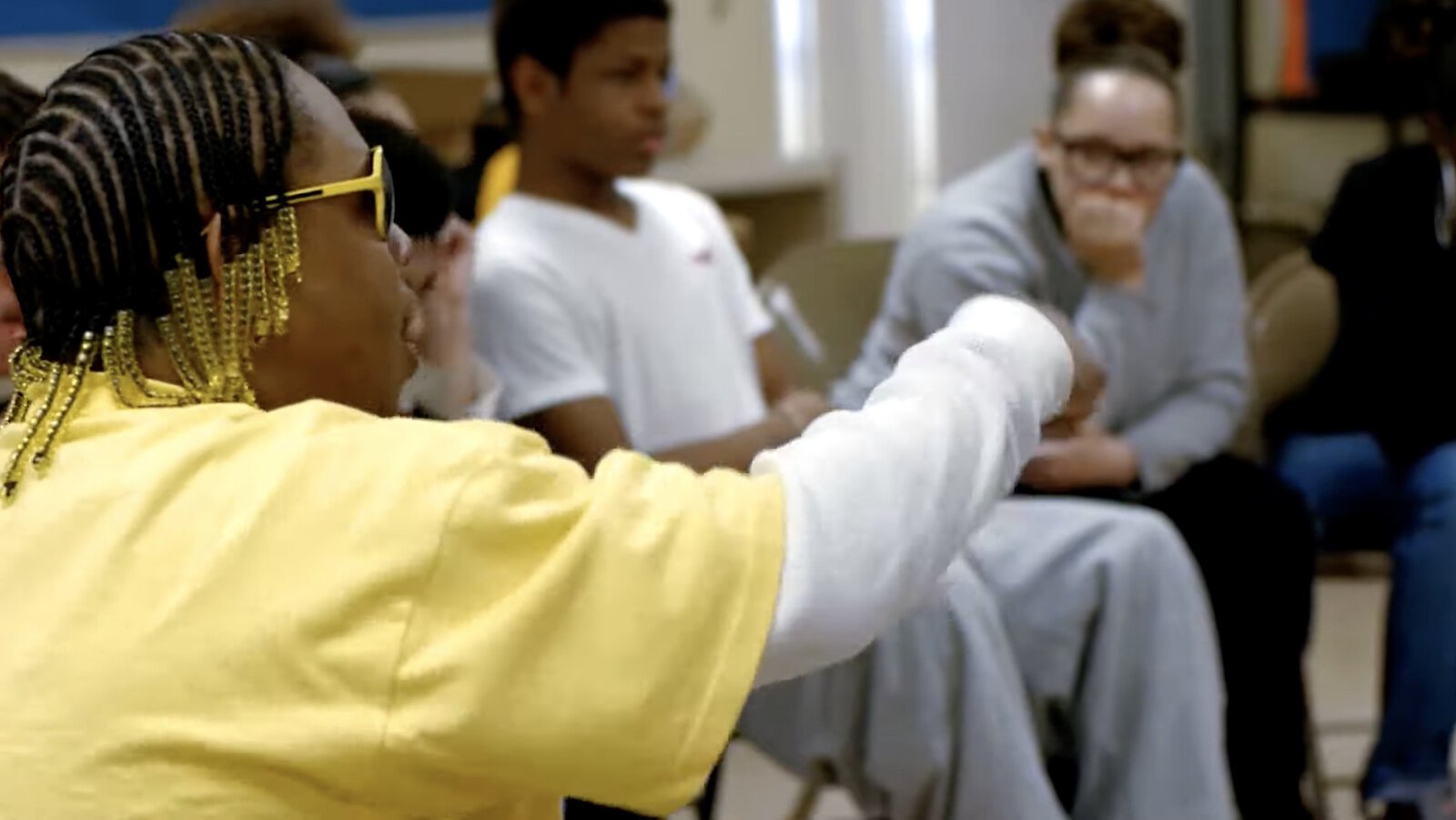 Yafinceio Harris talks to a group of students. From the mini-documentary Peace During War.