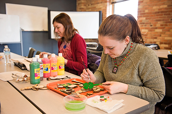 On any given Tuesday or Thursday evening a group of women meet in a room inside the Haymarket Building in downtown Kalamazoo to bounce ideas off of one another while working on projects such as building a robot or a table.