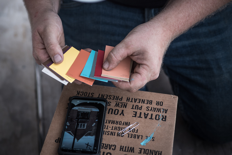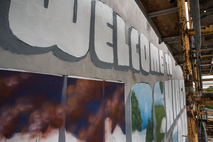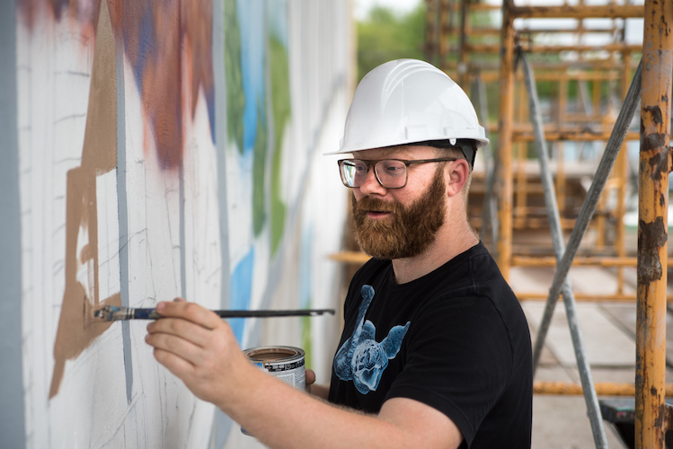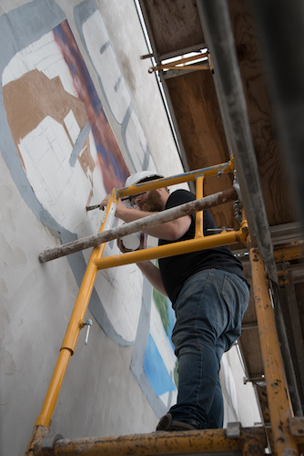 Hershberger, an Edison resident muralist who has been commissioned to paint a postcard-like welcome mural on what is known in the neighborhood as the Green Building adjacent to Howard’s Party Store, was 50 feet up on scaffolding, spraying in cloudscape as he spoke with On the Ground.