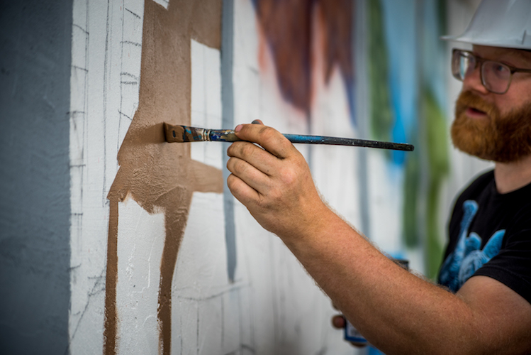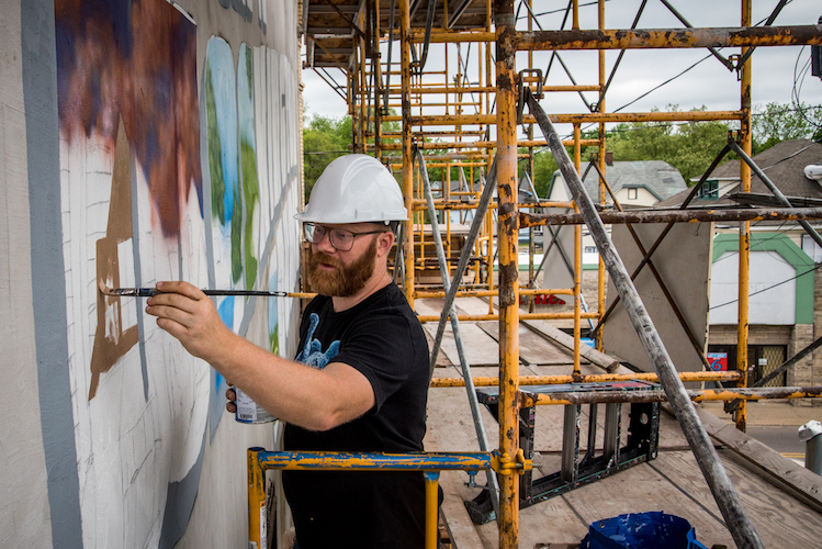 Weather permitting, the mural, 35 by 15 feet, will be nearing completion by the Edison Art Hop on Friday, June 1. Two years in the planning and designing, the project was funded by the Arts Council of Greater Kalamazoo to conceal a wall that looked blighted, with bricks and blocks missing. Buildings Restoration, Inc., completed restoration and resurfacing before Hershberger began painting.