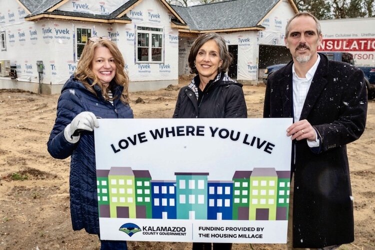 Courtesy Kalamazoo County – Kalamazoo County Housing Director Mary Balkema, left, stands with Portage Mayor Patricia Randall and Kalamazoo County Board Chairman John Taylor in front of a multi-unit project in Portage that is receiving money from the county’s new house in millag