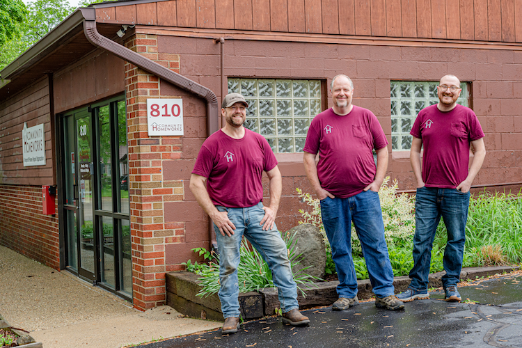 Community Homeworks is supported by the First United Methodist Church. Scott Moore, Home Repair Technician, Construction Manager Tom Tishler, and Executive Director Chris Praedel from Community Homeworks.
