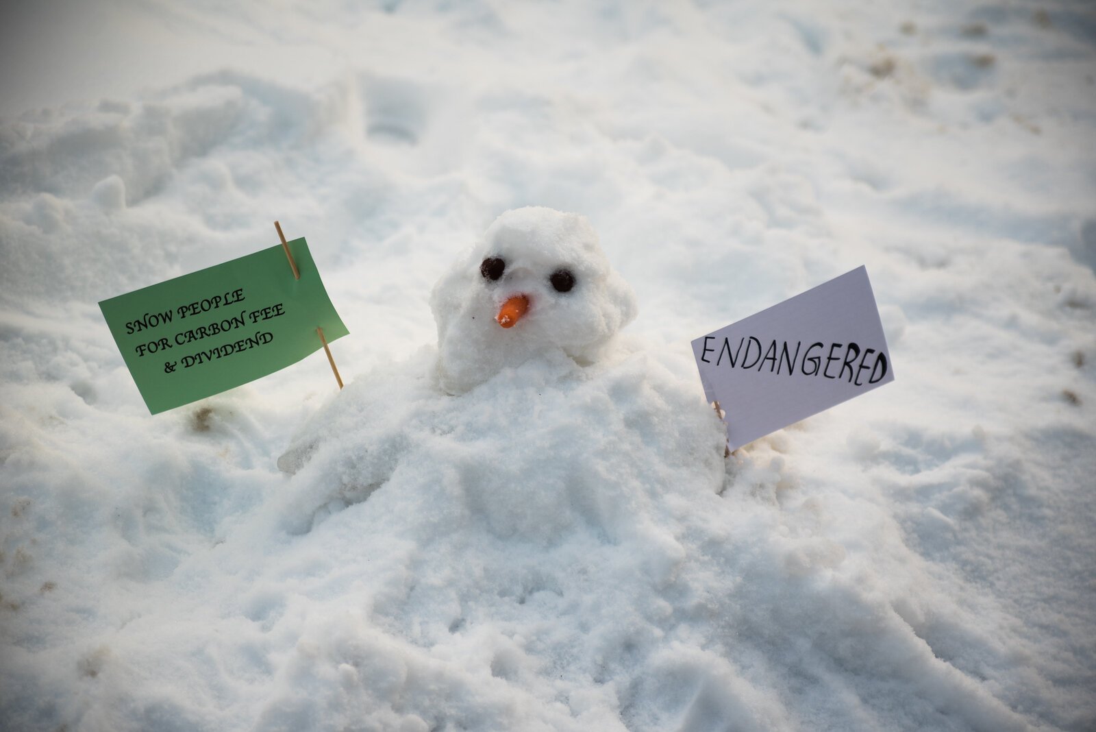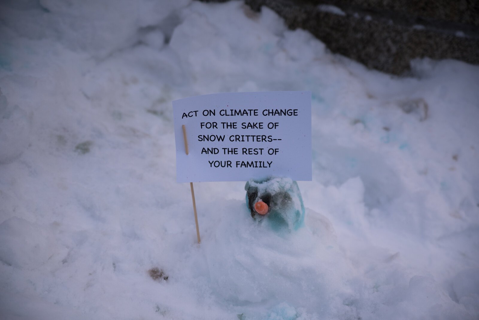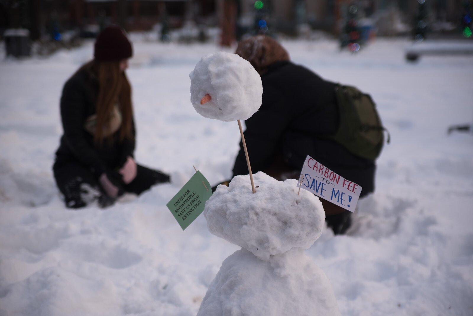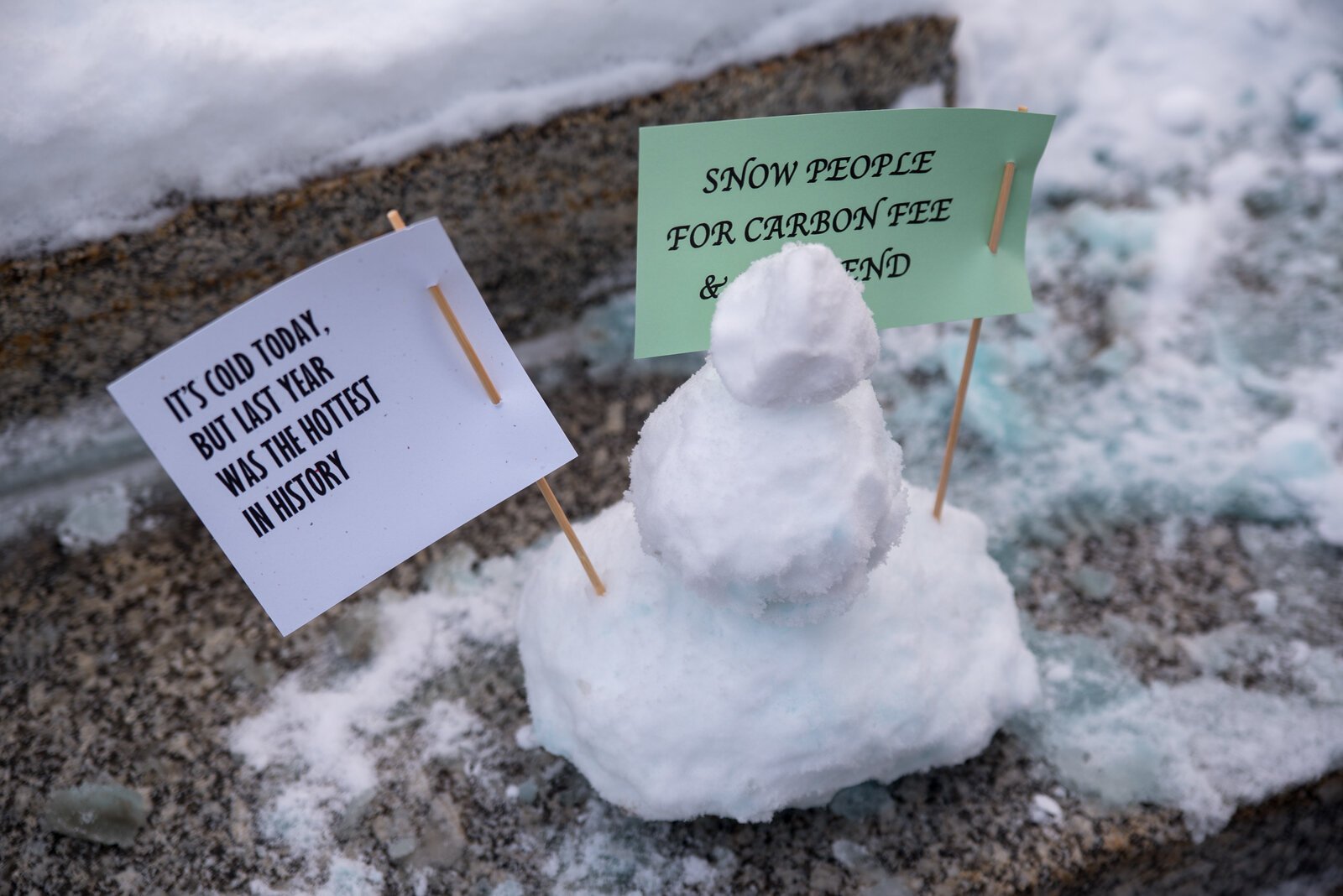 As the temperature hovered in the low 20s, several teens did their best to cobble together mini snow people in a variety of shapes, then donned them with signs that read “Carbon Fee. Save me!” and “I’m melting!”
