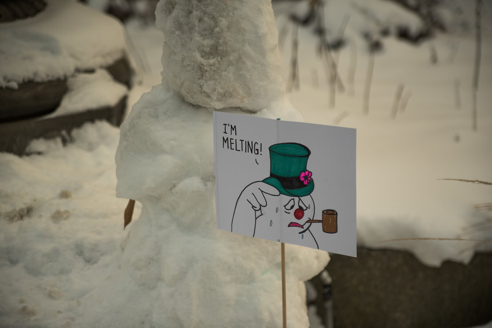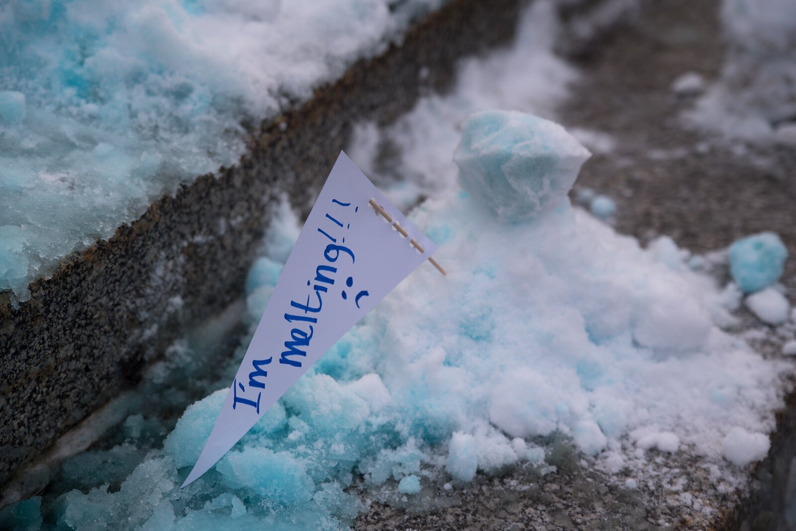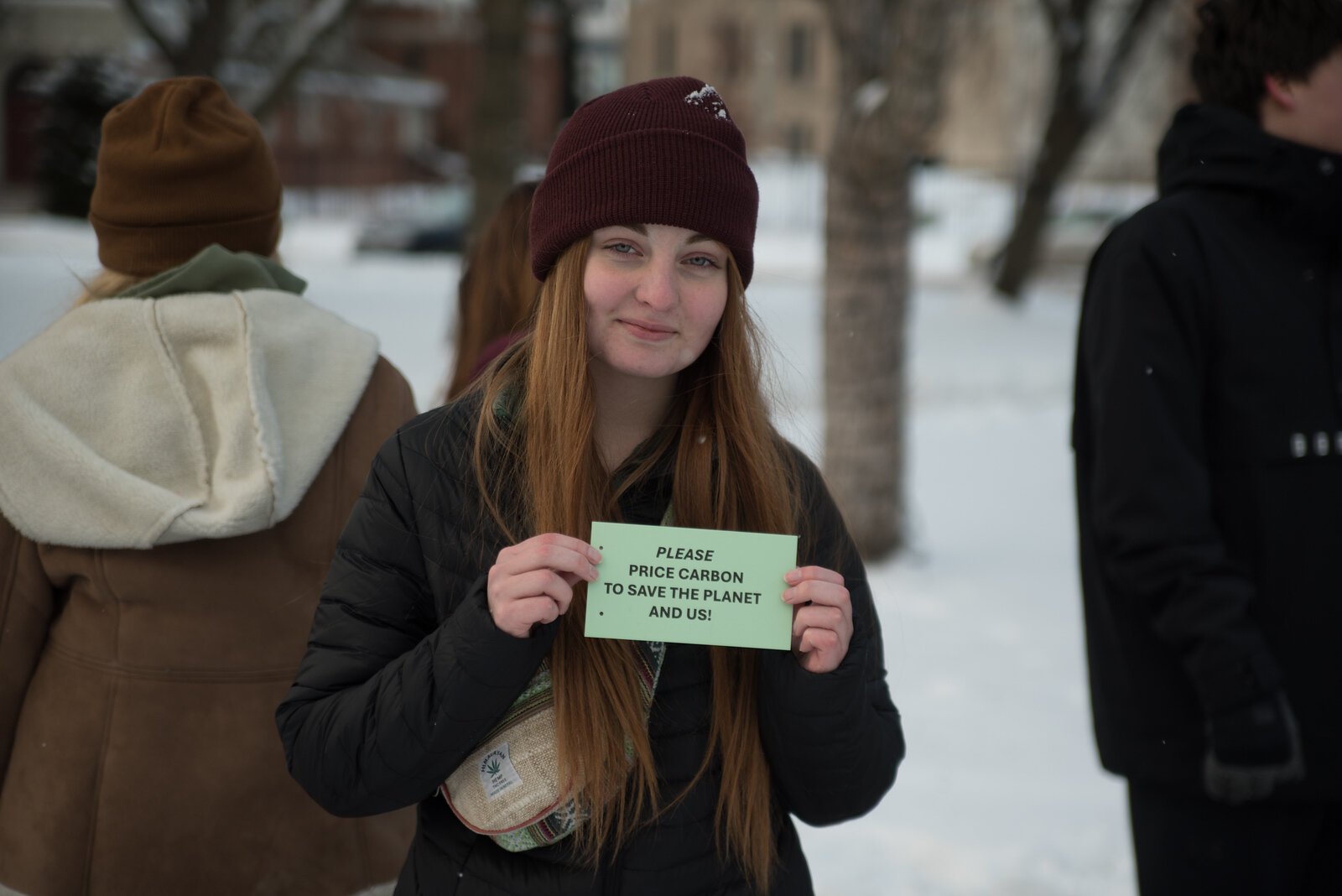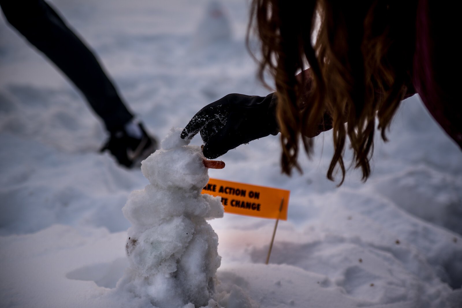 As the temperature hovered in the low 20s, several teens did their best to cobble together mini snow people in a variety of shapes, then donned them with signs that read “Carbon Fee. Save me!” and “I’m melting!”
