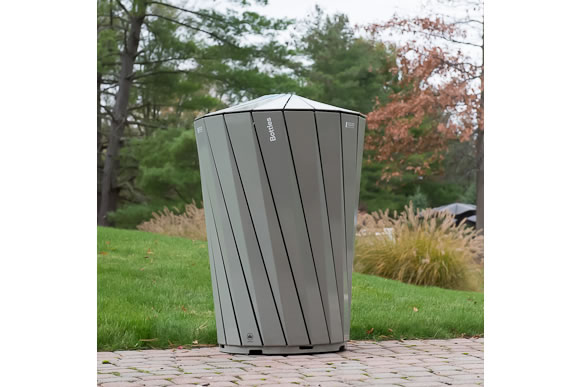 Technical expertise in sustainable materials came from Alcoa. The units are made of 30 percent aluminum and are 100 percent recyclable. They have a hinged top and hold a polyethylene liner that can be used with or without a plastic bag, making them easy for park workers to empty and transport.