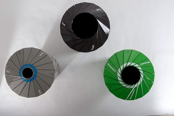 The Central Park Conservancy receptacles are identical in size and shape, different in color and in the size of top openings: gray with blue around the aperture for cans and bottles,”conservancy” green for paper, and tan for waste.
