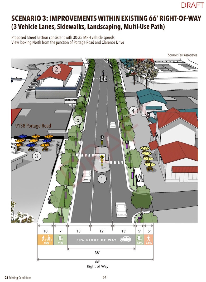The favored Scenario #3 shrinks Portage Road to three lanes — it makes use of existing road space, not property. “That’s why we’re doing this one, because we’re not taking anything,” he says.