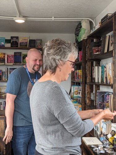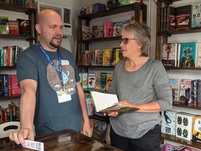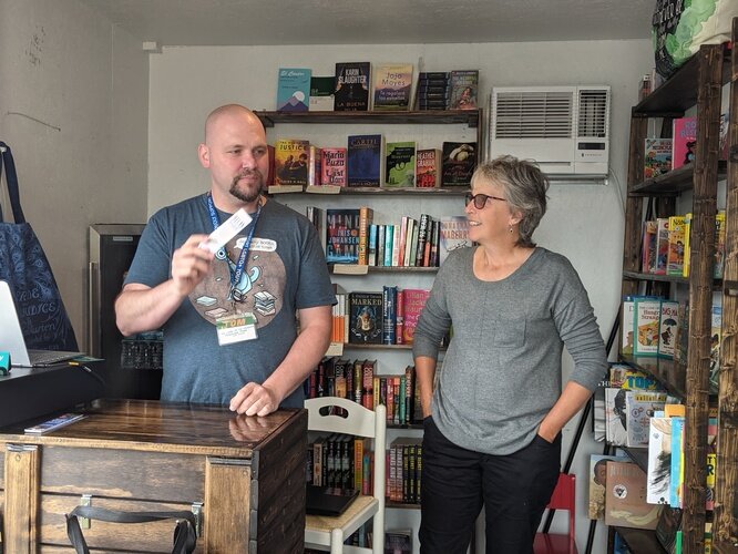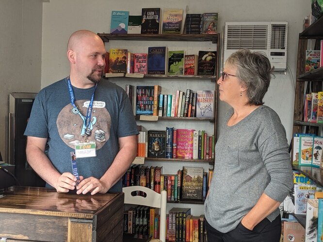 Tom Batterson and customer Laura Webb chat together inside his cargo container store, New Story Community Books.