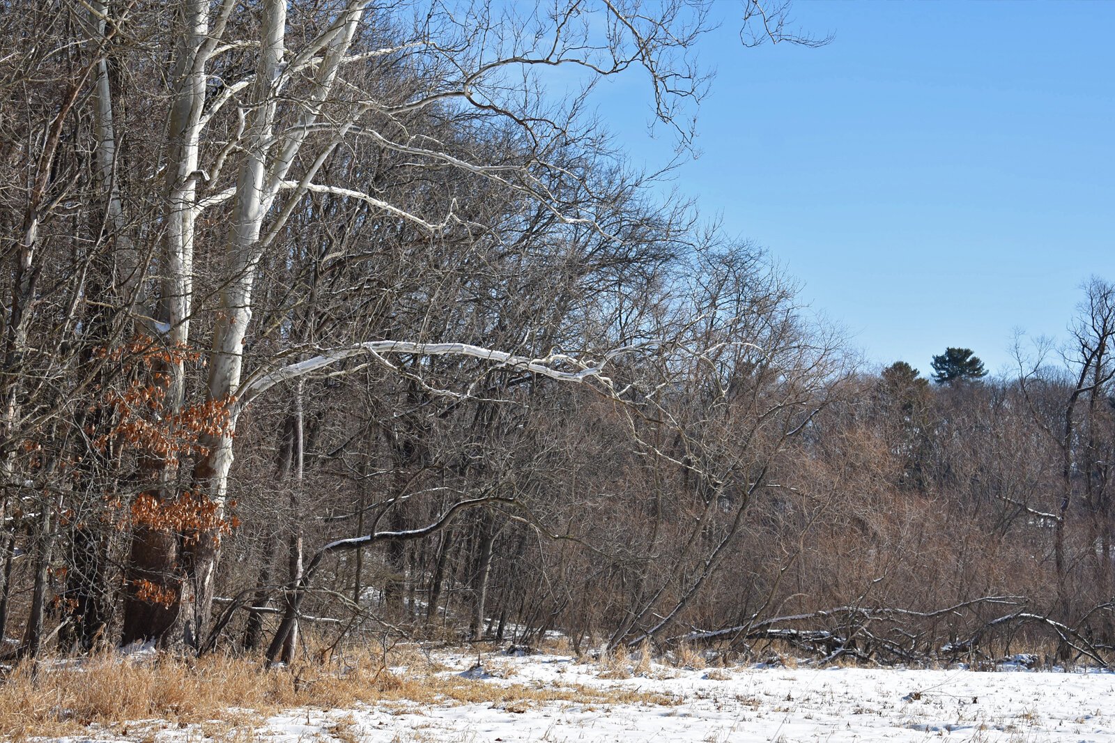 Sycamore trees set off the winter landscape at the new Armintrout-Milbocker Nature Preserve.