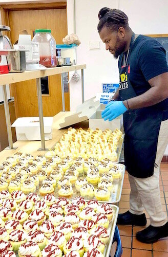 Courtesy of DeMargeo C. White – DeMargeo C. White, owner of Huey D’s Goodies, prepares 576 cupcakes recently for Portage dentist Dr. Kenneth W. Grabowski.