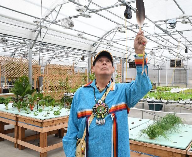 Doug Taylor, Historic Preservation Officer, lifts an eagle feather inside the greenhouse at the reservation.