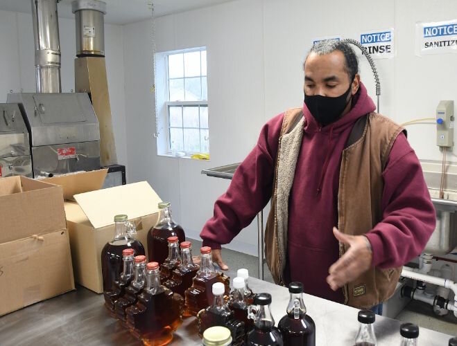 Robert Williams, Environmental Technician, points out some of the maple syrup produced in the sugar shack at the Pine Creek Indian Reservation.