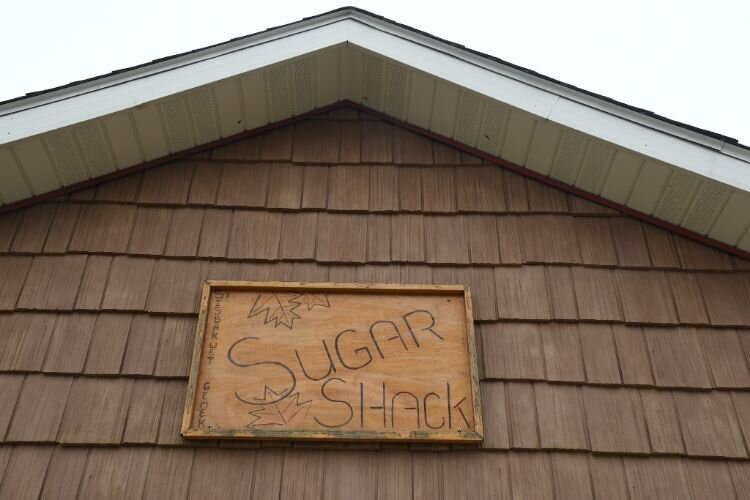 Sign over the doors at the front of the sugar shack.
