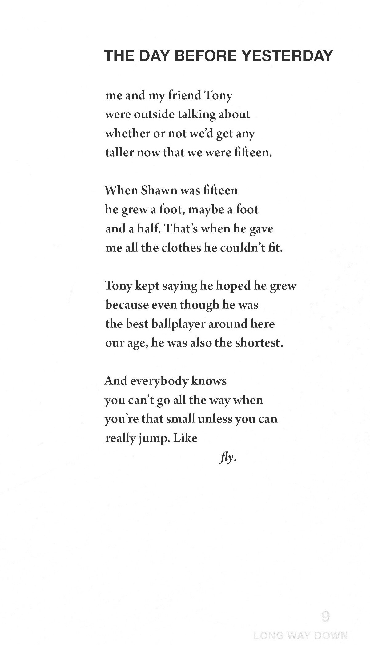 “Long Way Down” is over 300 pages long, an intimidating length. But on each page is a short bit of free-verse, edgy and blunt.