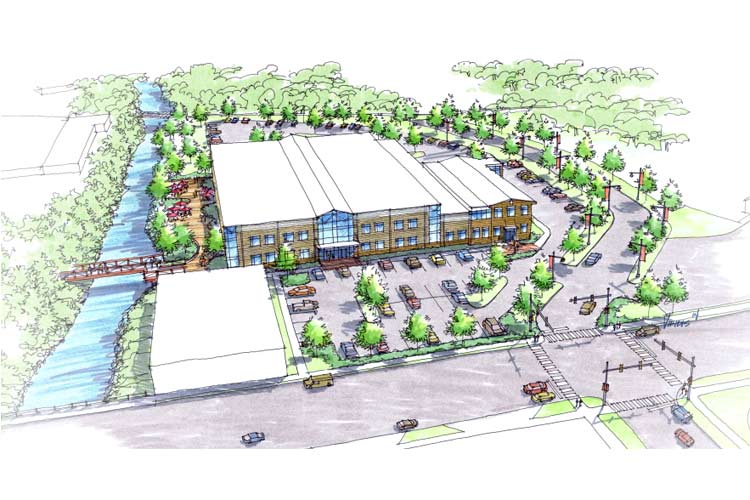 Plans presented at the groundbreaking show the approximately 53,000-square-foot project will feature business suites, a shared plaza and patio along the river, and an on-site restaurant. An anchor restaurant has committed to opening there.