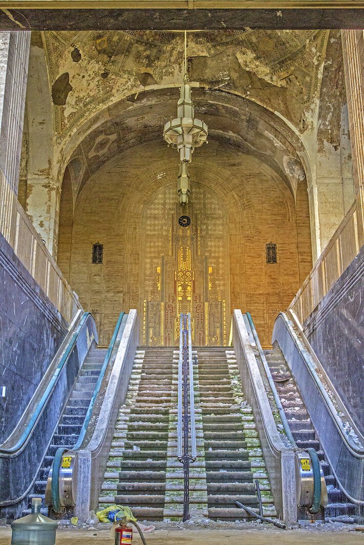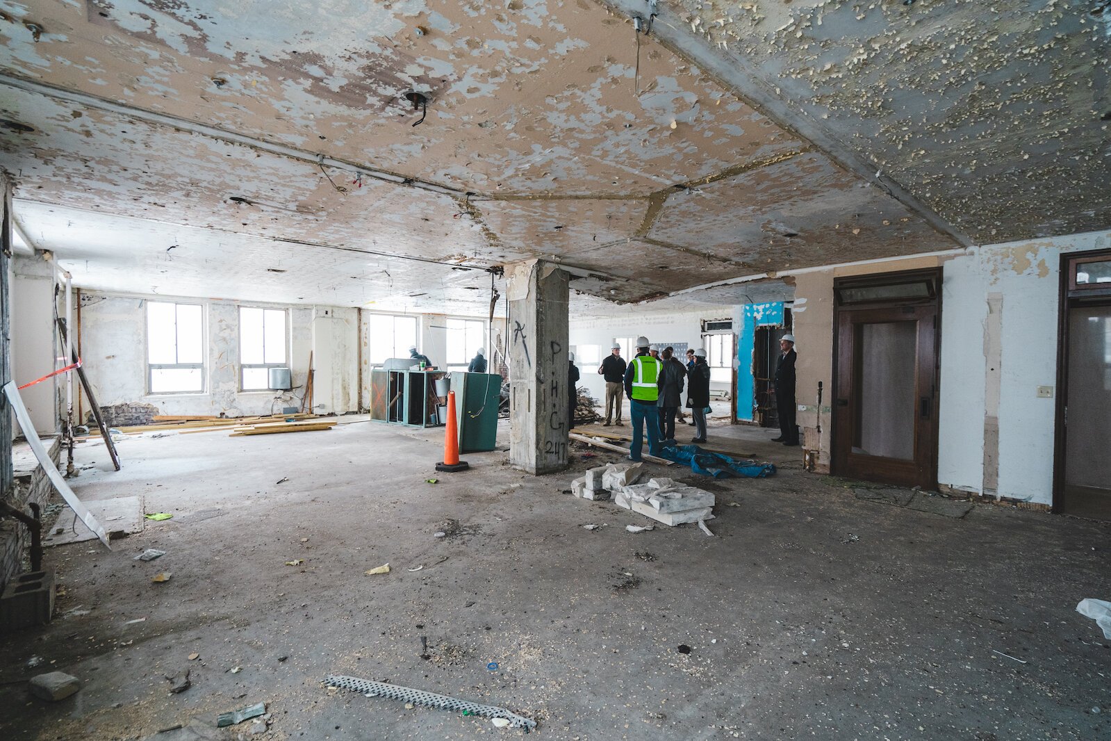 “It looked like something that got bombed out in World War II,” Harmsen says. “The bank vault door was covered in rust. The ceilings had collapsed everywhere. Rubber membrane roofs and the roofs were gone. It was like a rainforest in here and because of all of the mold, we had to wear full Hazmat suits to enter the building. Most people said we should tear this building down.”