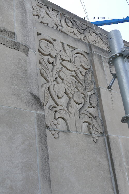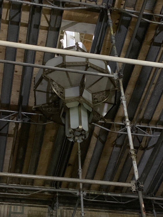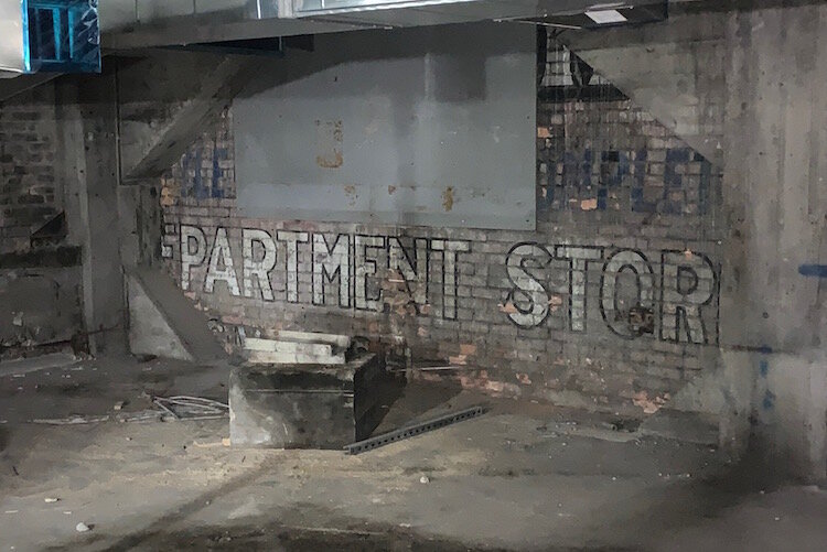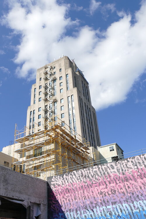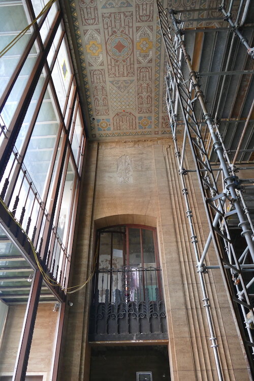 In its heyday, the building’s escalators were said to be a major city attraction and it contained some of the best art deco in the Midwest. These days, those same escalators are not operational and covered in dust from construction inside the building. The painted art deco designs on the ceilings have faded with time, but are still visible throughout much of the building.