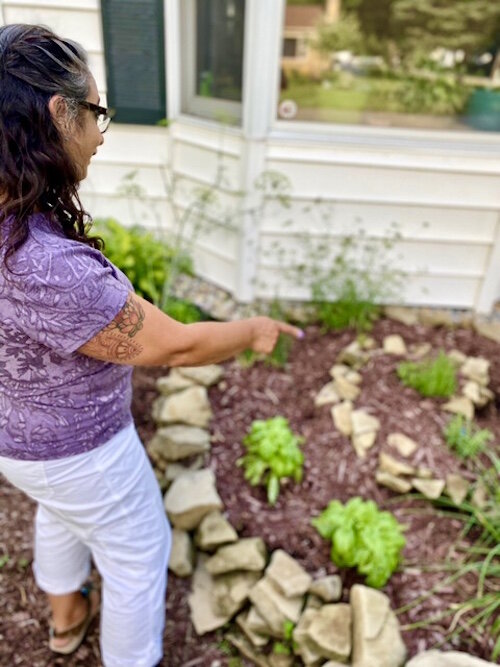 “So I just put some plants out front,” she says. “My husband dug up some grass between the sidewalk and the road and transplanted some of my larger plants that started from seed. A few people dropped off some plants and we had an herb garden.”