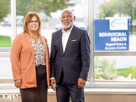 Encore/Brian K. Powers – Beth Ann Meints, administrator of clinical services at Integrated Services of Kalamazoo (ISK), and Jeff Patton, ISK CEO, stand inside the lobby of the new Behavioral Health Urgent Care and Access Center. Encore/Brian K. Powers