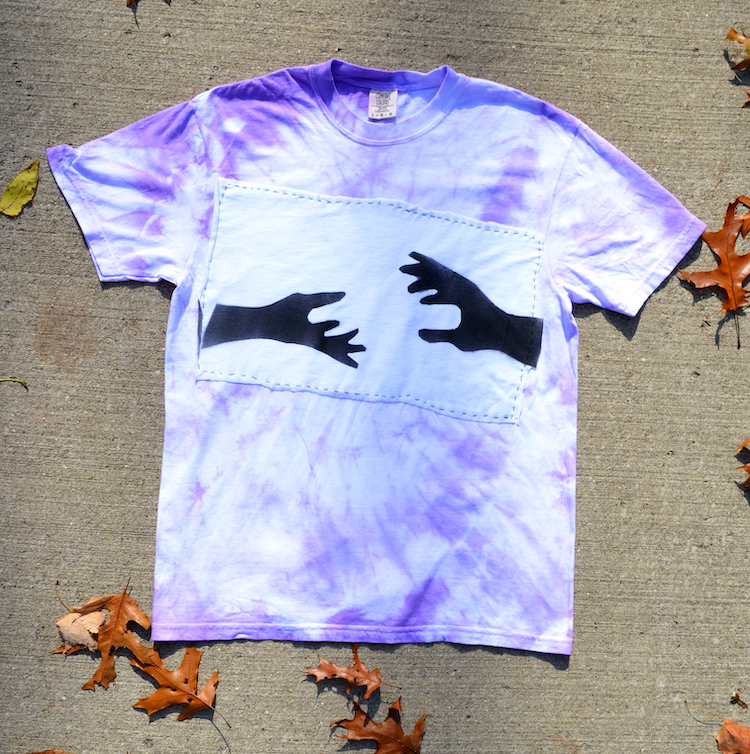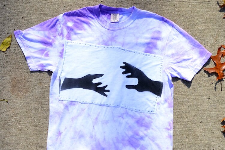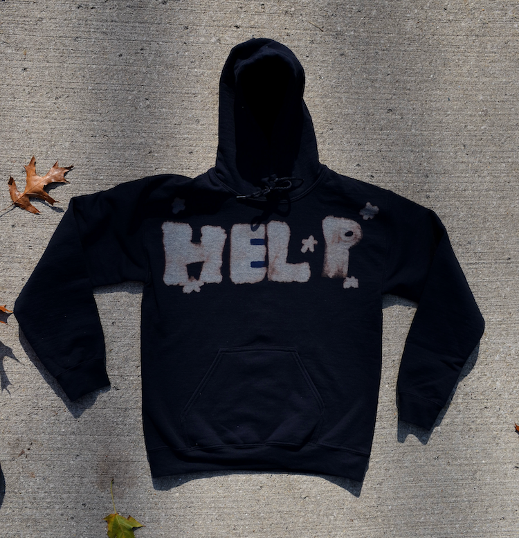 Artist Statement: My project is about how mental health affects students in school. I thought about different ways the topic can impact us negatively, but I focused on how we can help each other. My art shows how a helping hand can sometimes be all that people need. I used dye and clothing provided by my mentor to create this piece. I also used bleach to paint words on the hoodie.