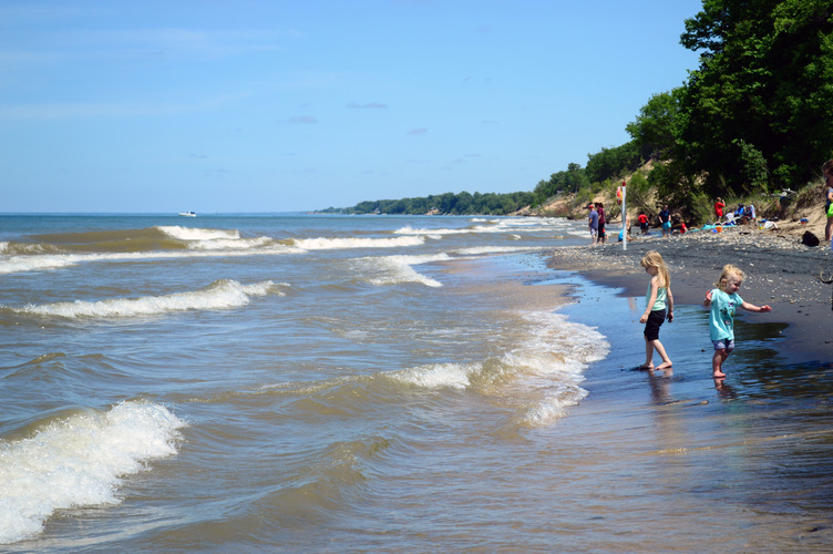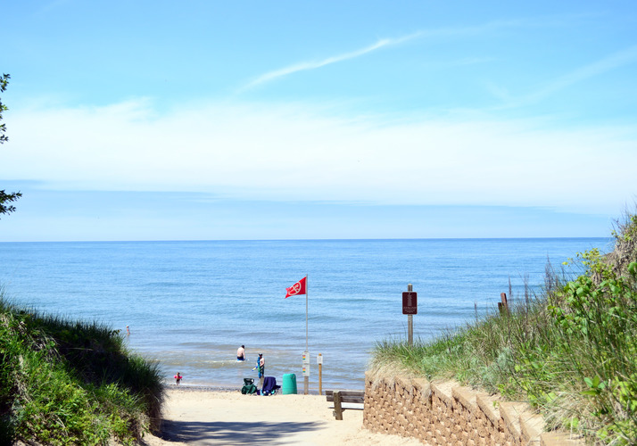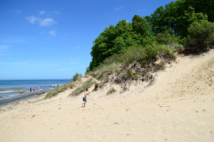 Go to the beach. The sand dunes are towering over the lake. Waves are high, there’s a no-swimming flag out, but families are frolicking at the edge of the water. I walk in ankle deep. The water is freezing. It’s hot today, but it seems like freak spring snow was just weeks ago.