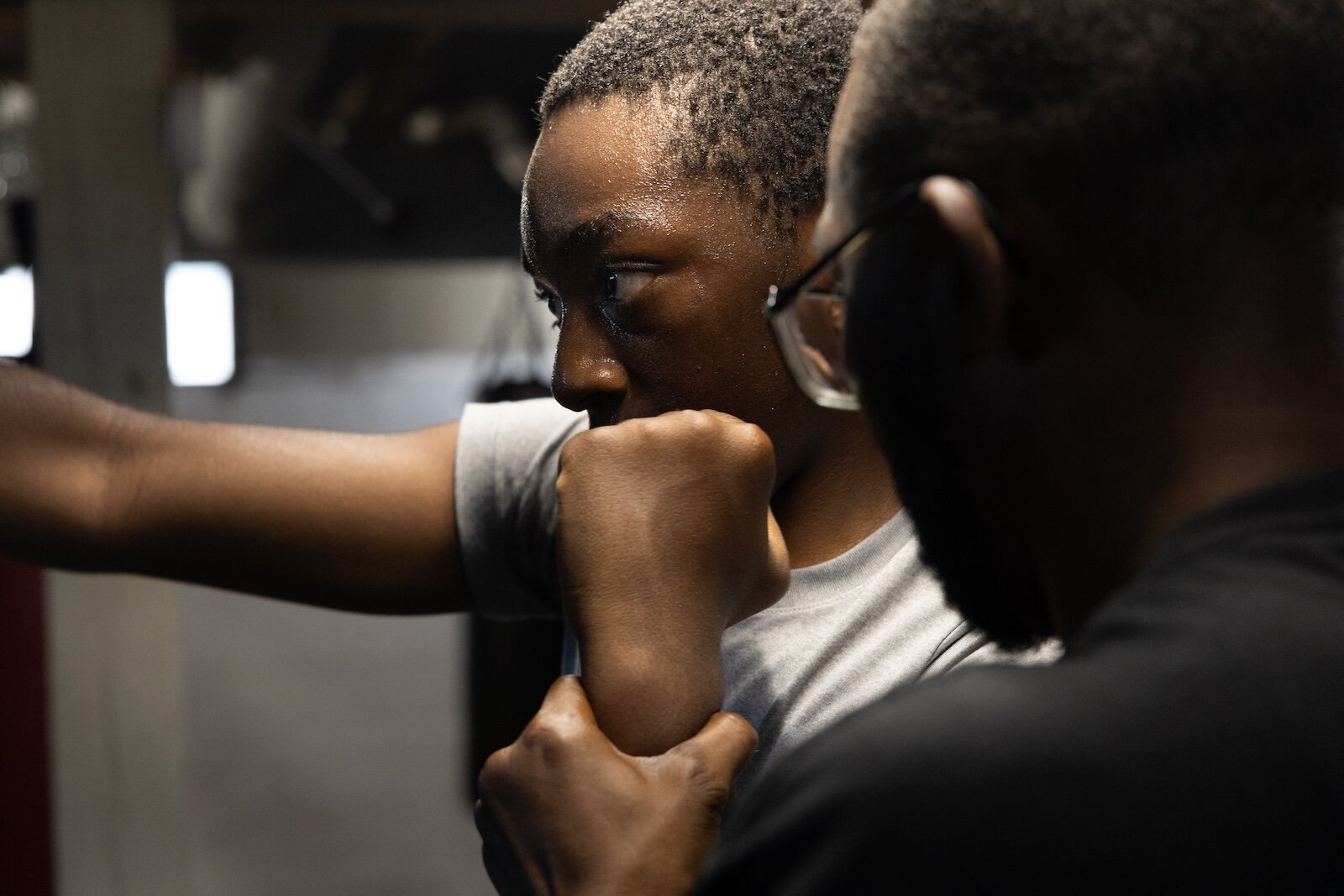 Aimua Osuki, 13, right, trains under the steady gaze of Coach Ja, left. Osuki was 6 when his parents emigrated from Nigeria to Lansing, MI. They moved again to Kalamazoo when he was 8. He is one of the newest arrivals at ChampsDen.